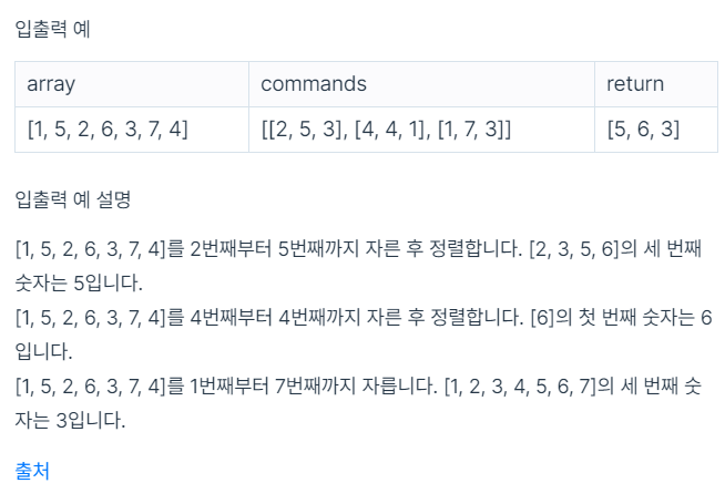 - 문제 배열 array의 i번째 숫자부터 j번째 숫자까지 자르고 정렬했을 때, k번째에 있는 수를 구하려 합니다. 예를 들어 array가 [1, 5, 2, 6, 3, 7, 4], i = 2, j = 5, k = 3이라면 array의 2번째부터 5번째까지..