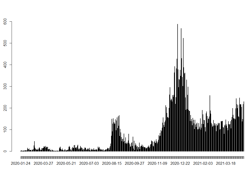 2. 서울시 날짜별 확진자 수 꺾은선 그래프 (R)