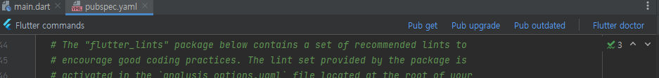 이후 main.dart 코드에 많이 빨간줄이 뜰텐데 상단에 뜨는 Get dependencies 를 실행하면 끝