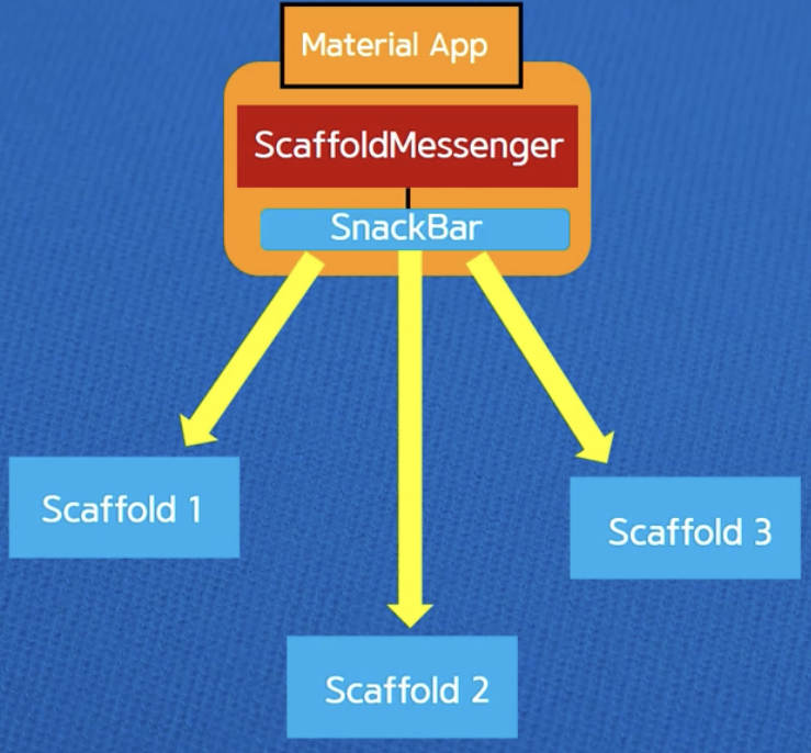 이를 해결하기 위해서 그림처럼 위젯 트리 최상위 위치에서 흩어져있는 작은 Scaffold를 등록해서 언제라도 SnackBar를 수신할 수 있도록 한 곳에 묶어서 관리하는 것. == ScaffoldMessenger