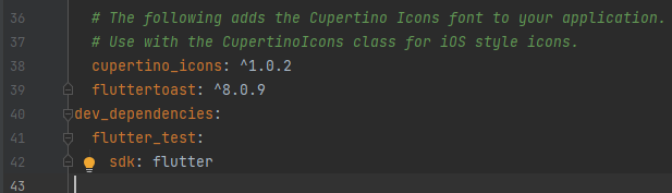 2. [탭1번]fluttertoast: ^8.0.9 붙여넣기 (들여쓰기 주의!!)