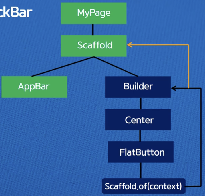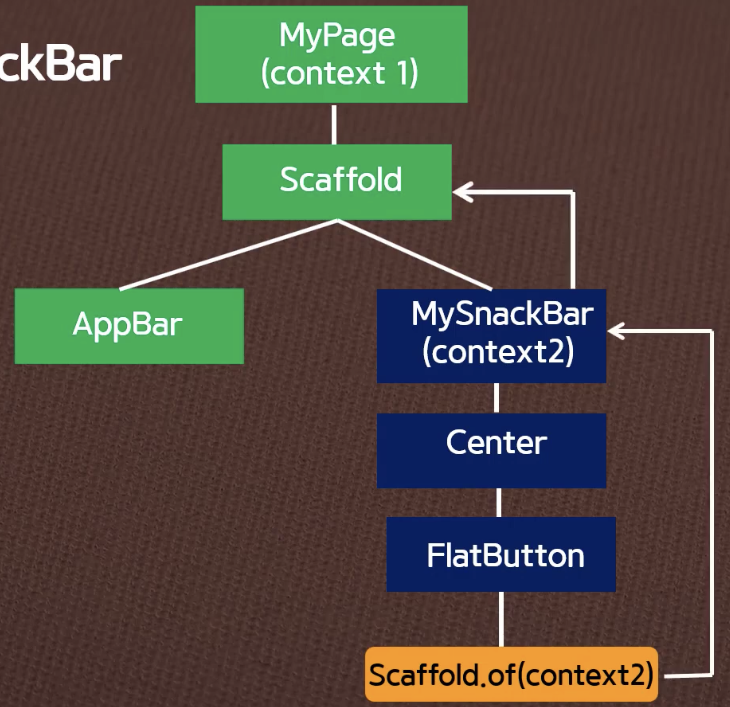 위젯 트리에서 Scaffold 밑에 MySnackBar라는 커스텀 위젯을 생성해서 Scaffold.of 함수가 MySnackBar의 context를 가지고 Scaffold를 찾아서 올라오는 방식