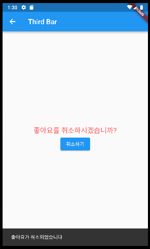 > 왼쪽페이지(HomeBody)에서 스낵바를 띄운 상태에서 오른쪽페이지(SeceondPage)로 이동해도 여전히 스낵바가 떠있는 것을 확인할 수 있음