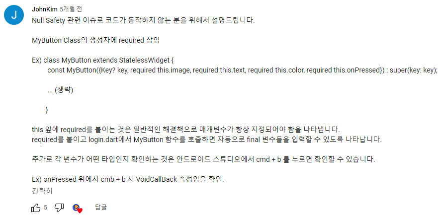 강의에서 처럼 required를 붙이지 않으면 오류가 뜸. 강좌 이후 Null safty 이슈로 문제가 뜨는 것