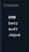 List<String> carMaker = [ 'BMW', 'benz', 'audi', 'Jagua'];