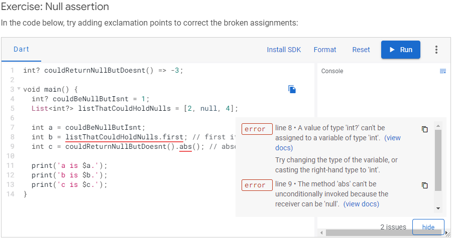 1) 모든 변수는 null이 될 수 없으며, non-nullable 변수에는 null 값을 할당할 수 없음