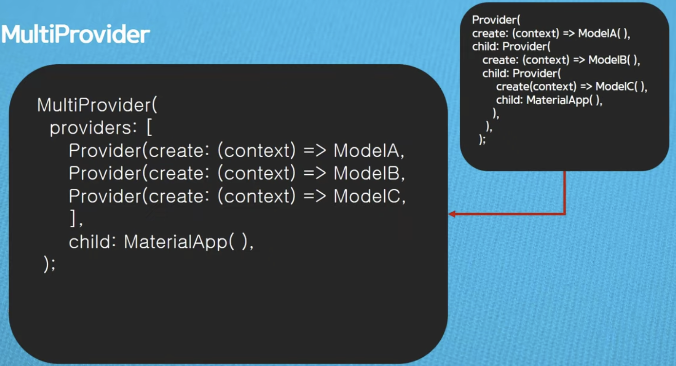 - ChangeNotifierProvider가 두개 있을 때 한 위젯에서 둘 다에 접근해야할때 사용하기 위한 방법